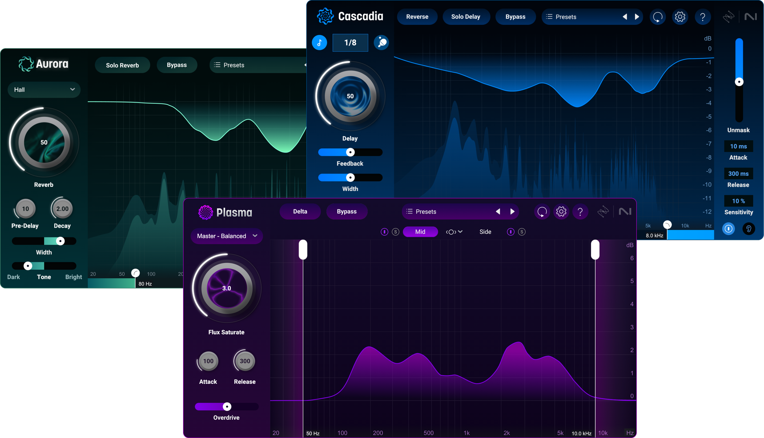Plasma, Aurora, and Cascadia are intelligent audio plugins built on a shared philosophy: powerful processing with simple controls. Plasma delivers dynamic spectral saturation, Aurora adds clarity-preserving reverb with auto-unmasking, and Cascadia creates clean, spacious delay. Each product has a distinct character, unified by a common interaction model designed to produce high-quality results with minimal input.