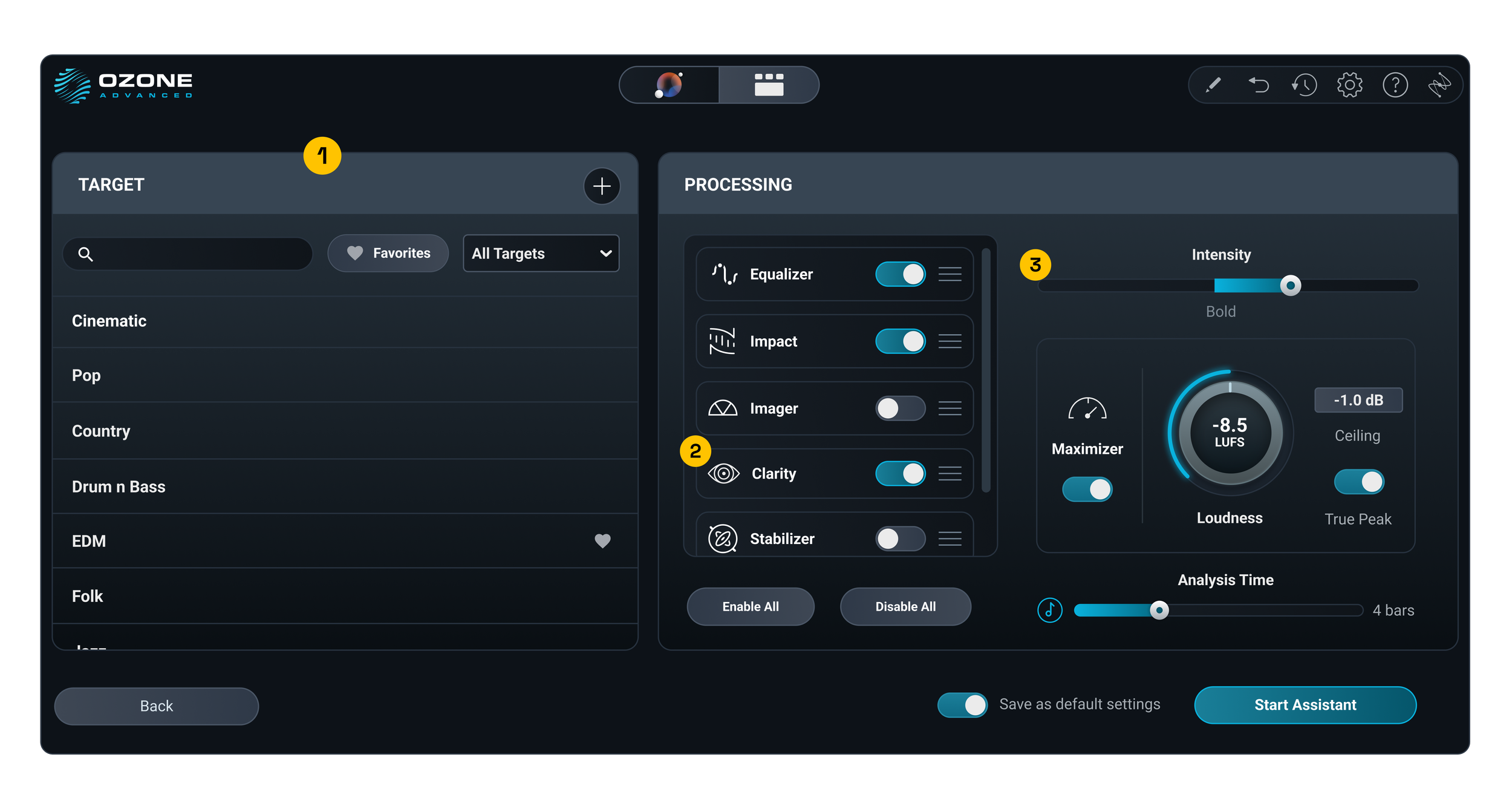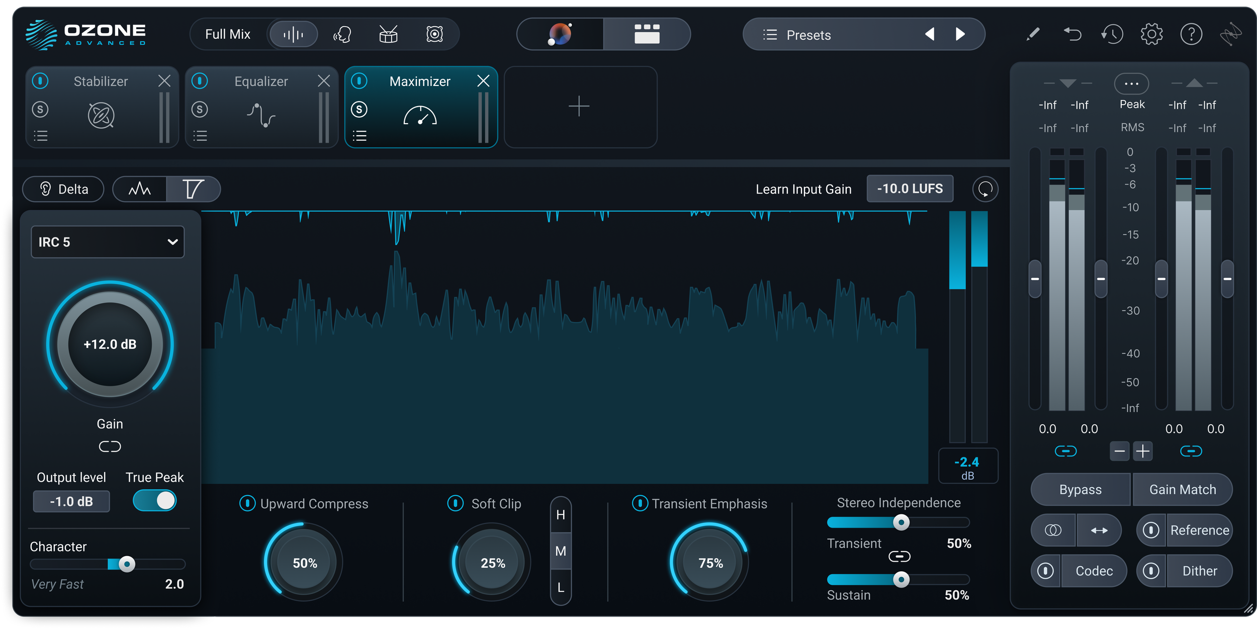Intensity and loudness controls help set the desired level of transparency with the processing and the target output loudness